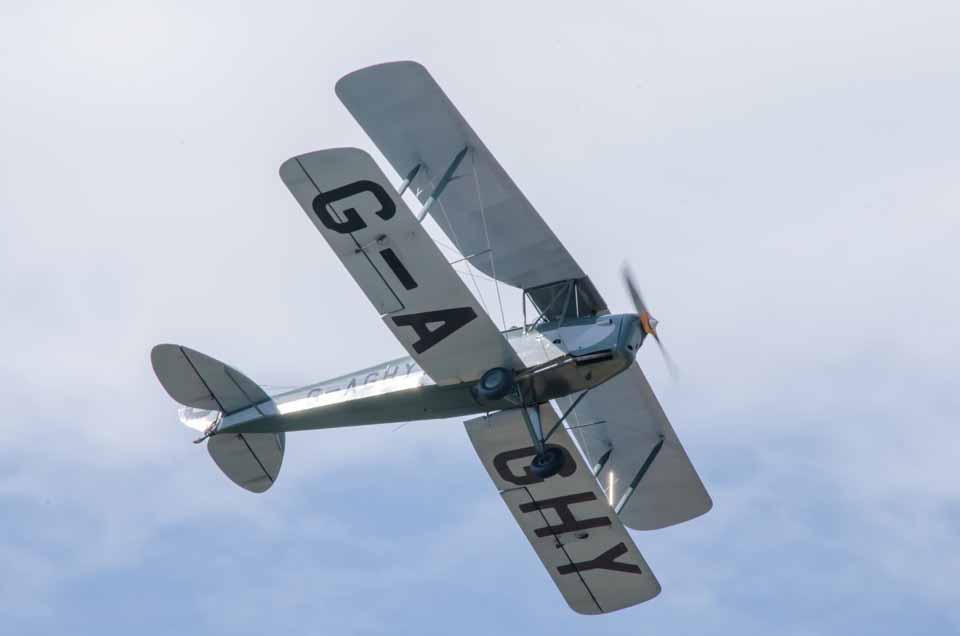 Tiger Moth at Lee on the Solent airfield approaching from over the Solent