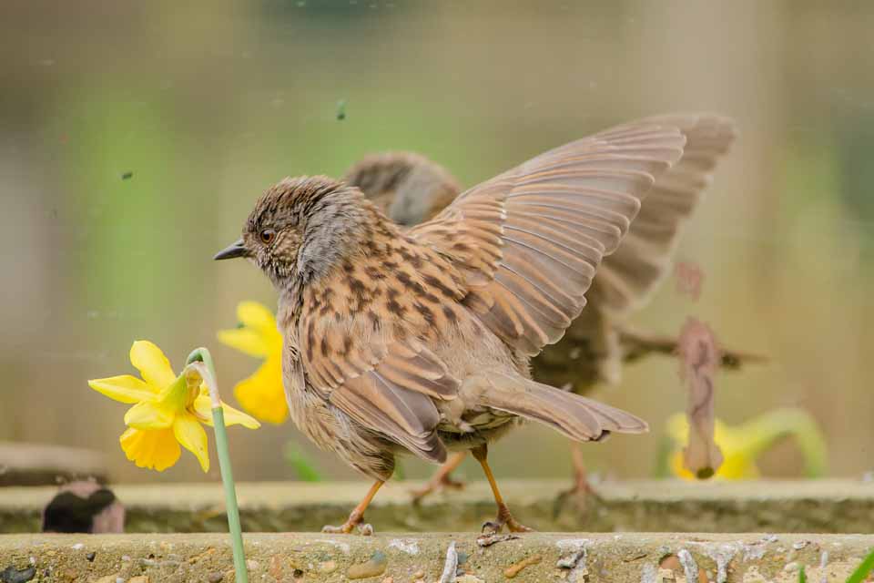 Dunnock ‘displaying’ to its reflection in a mirror.