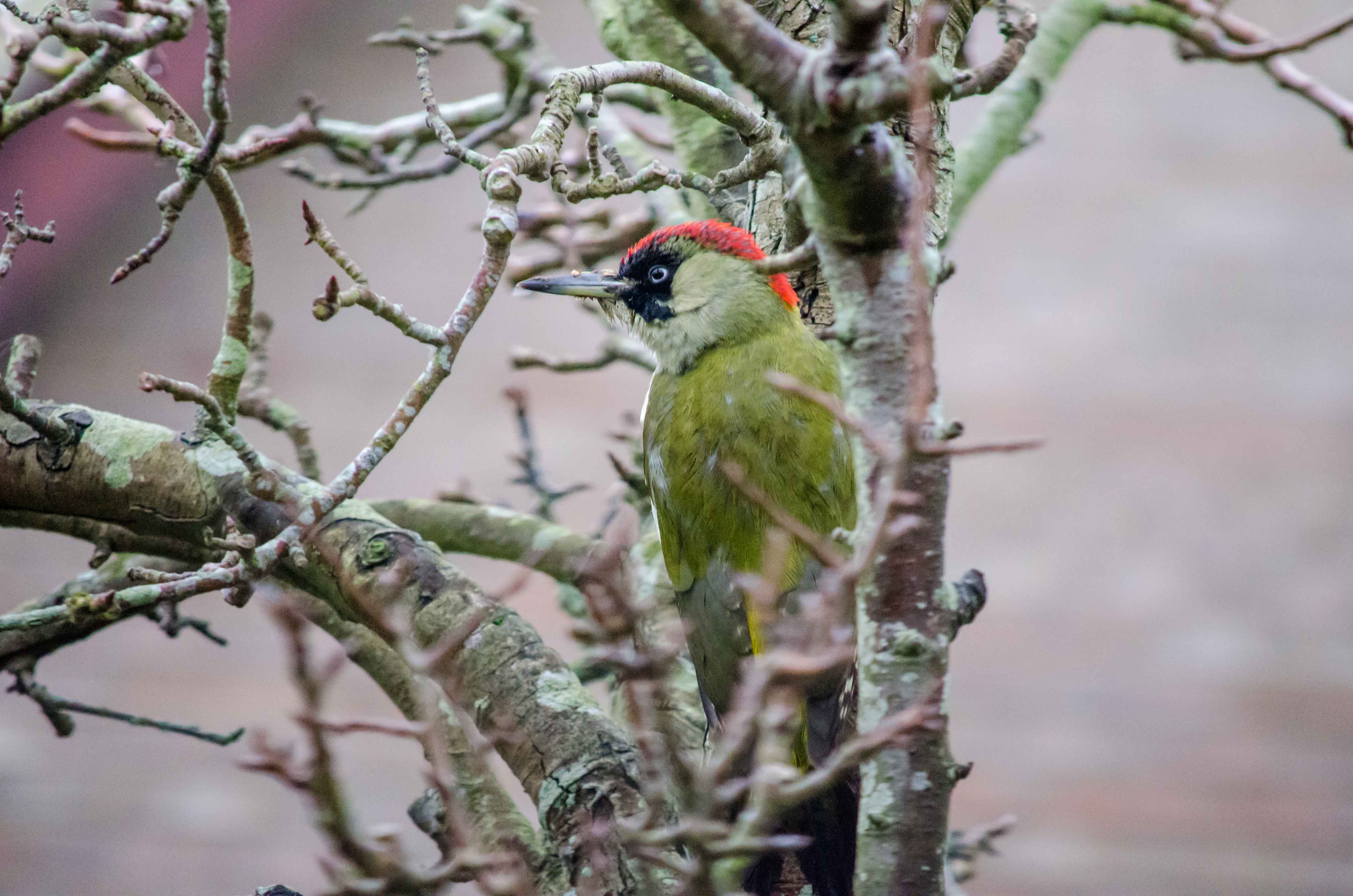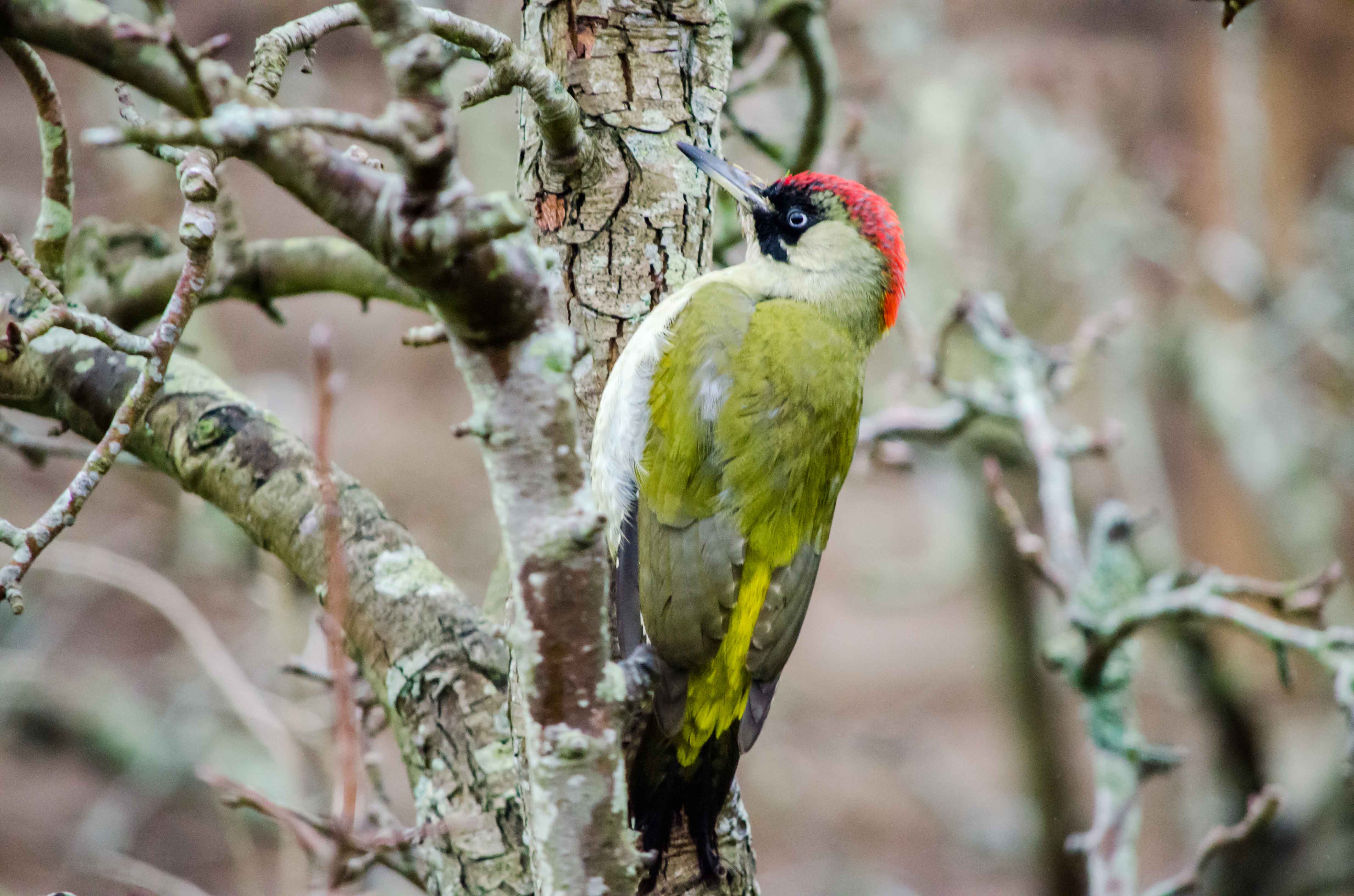 Green Woodpecker. First time I’ve seen one of these close to our garden. Usually common in deciduous woodlands with a preference for areas with large clearings and rides. Can also be found in more open land with scattered trees and groves. This one turned over the leaves on the ground before looking for food in the tree and kindly stayed long enough for a few shots.